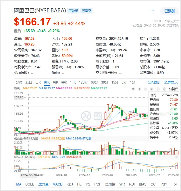 截至9月17日,阿里美股股價(jià)報(bào)收166.17美元/股,市值3961.49億美元。若段永平這季度沒有繼續(xù)減持,仍持倉375萬股,他對(duì)阿里的持倉市值已達(dá)到6.23億美元,賺了大概1.98億美元(約14億人民幣)。